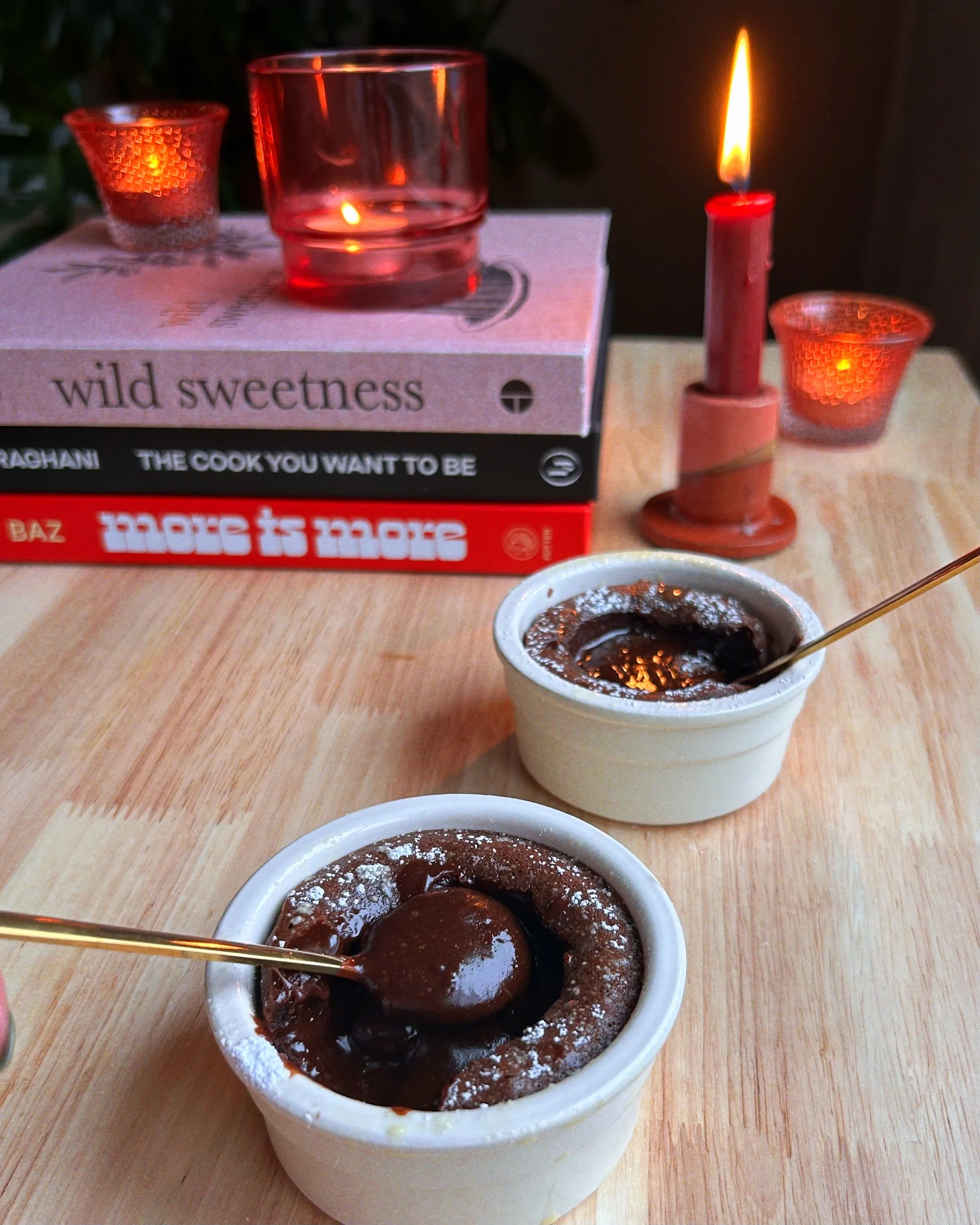 Just a like a normal lava cake, but instead of butter we’re using olive oil! This makes for a silkier, more luxurious batter and maybe you can trick yourself into thinking it’s healthy? Meh, who cares. See how it’s made here.